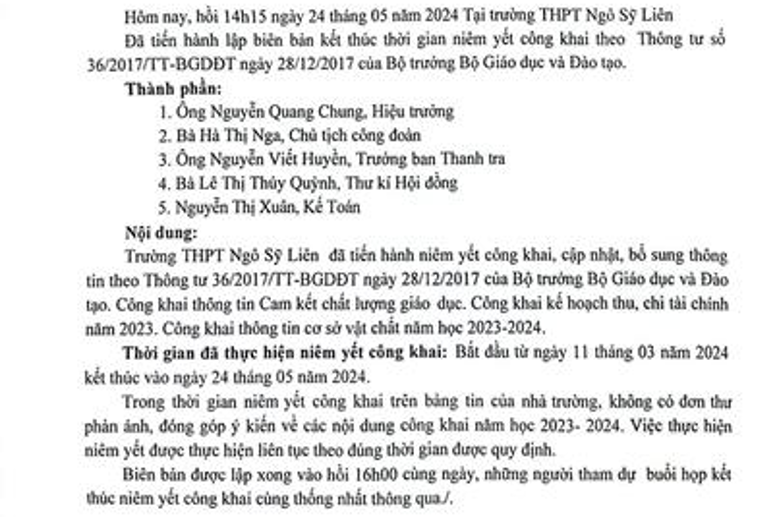Về việc thực hiện kết thúc niêm yết công khai theo Thông tư 36/TT/2017/TT-BGDĐT ngày 28/12/2017 của Bộ trưởng Bộ GDĐT