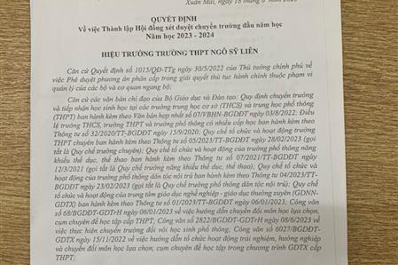 Thành lập Hội đồng xét duyệt chuyển trường đầu năm học .Năm họcc 2023-2024